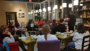 Deacon Kevin Sartorius, Director of Catholic Charities of Tulsa, meets with Catholic Young Adults of Tulsa in their final ‘Holy Grounds’ of the season. They